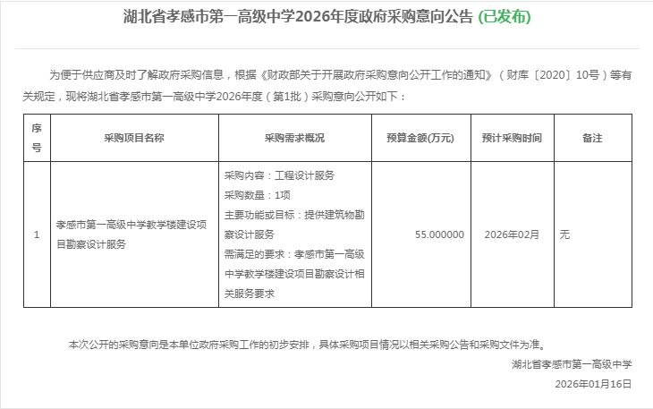湖北省孝感市第一高级中学2026年政府采购意向公告