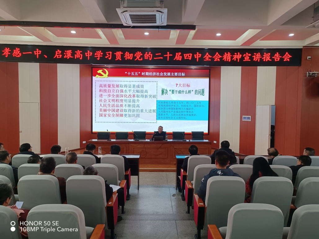 为深入贯彻党的二十届四中全会精神,切实把思想和行动统一到党中央决策部署上来,2025年12月18日,孝感一中特邀孝南区委党校杨德文副校长,为全体党员干部讲授了一堂题为“迈向新征程的行动纲领”专题党课。学校领导班子成员、全体党员及中层干部参加了学习。