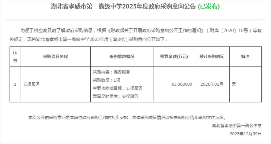 湖北省孝感市第一高级中学2025年度政府采购意向公告