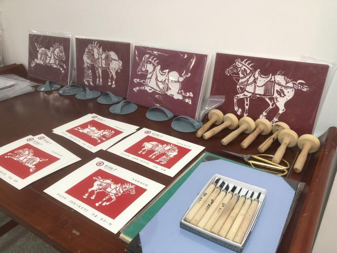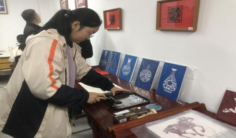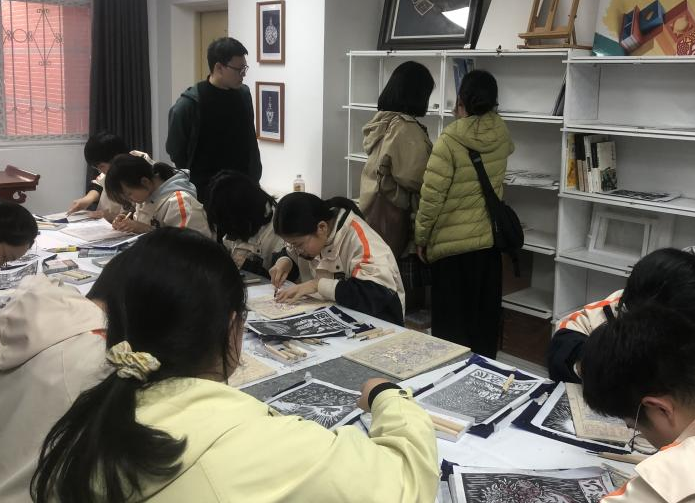 随后,与会嘉宾一同走进木刻版画工作室,实地参观学生版画作品,现场观摩学生木刻、印制等创作过程,对社团建设环境、教学成果与学生创作状态给予高度评价。