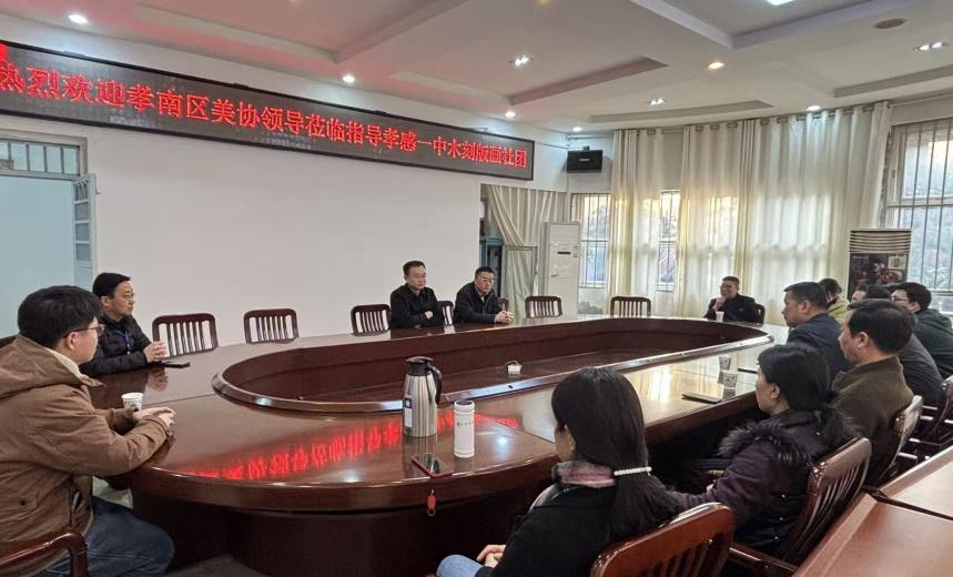 2026年3月12日,孝南区文联副主席、孝南区美术家协会主席周东,中国美术家协会会员、孝感市美术家协会副主席周梅元,中国美术家协会会员、湖北省国画院特聘画家张秀华,孝南区美协副主席贺江萍,孝南区美协理事、西湖中学副校长栾亚兰,孝南区美协理事、西湖中学美术教师张远斌,以及文昌中学美术教师吴恕娟、韩隶、彭翰枫、叶伶俐等一行,莅临孝感一中参观指导木刻版画社团建设工作。孝感一中校长夏以祥、副校长李绪凡、校办主任程国明、学生发展中心主任涂东方及美术教师王慧洋、程威等陪同参与。